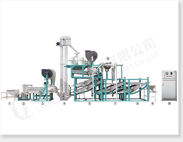 приёмный бункер ②  спиральный элеватор для подъёма сырья   многофункциональная машина для удаления примесей  ковшовый элеватор  главная машина (шелушитель, вибросито для удаления шелухи и вибросито для сепарации нелущённой семечки и ядра)  пневматическое подъёмное устройство   машина для повторной сепарации нелущённой семечки и ядраⅠ машина для повторной сепарации нелущённой семечки и ядраⅡ   бункер для сбора ядра   электрический управляющий шкаф