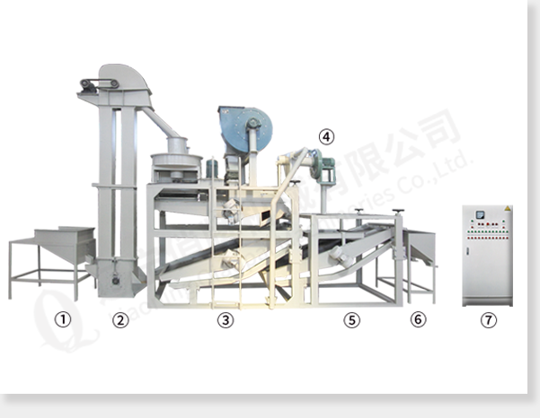 приёмный бункер  ②ковшовый элеваторглавная машина (шелушитель, вибросито для удаления шелухи и вибросито для сепарации нелущённой семечки и крупы)пневматическое подъёмное устройство  ⑤машина для повторной сепарации нелущённой семечки и крупыбункер для сбора крупы  ⑦электрический управляющий шкаф